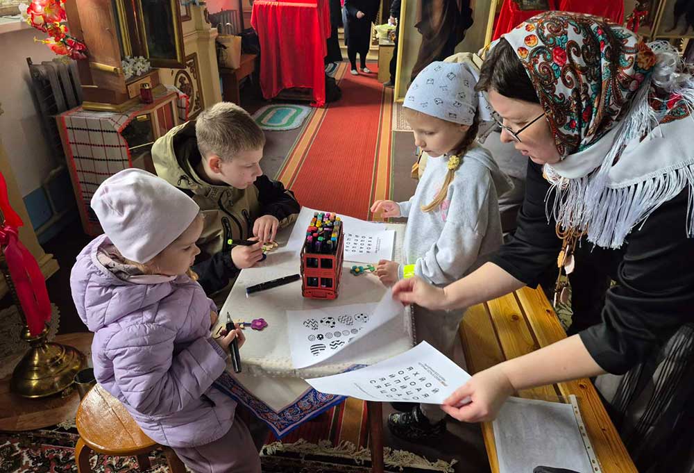 Взрослые и дети отгадывали ароматы, решали головоломку — «отваливали камень», собирали фразу приветствия Ангела во Гробе, вспоминали символику красного яйца и отгадывали песнопение по ритмическому рисунку. Квест показал: путь к радости лежит через единство, взаимопомощь и жертвенную любовь, о которой так часто напоминает Церковь.