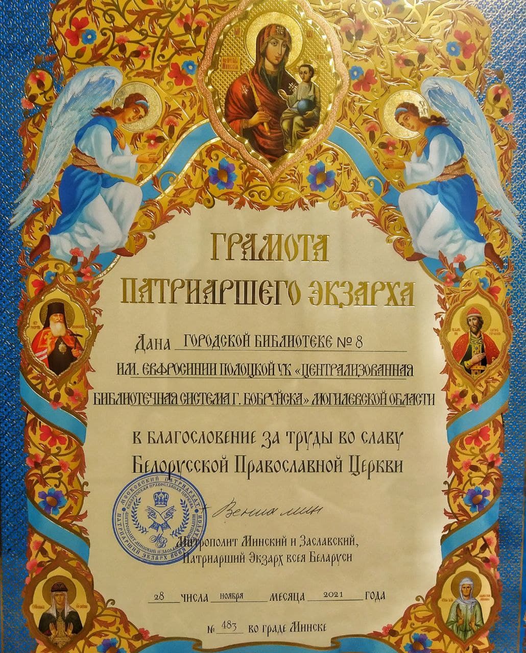 28 ноября 2021 года в рамках VII Белорусских Рождественских чтений «От купели крещения – к вершинам религиозной мысли: 1030-летие основания Полоцкой епархии и 200-летие со дня рождения Фёдора Михайловича Достоевского» в храме-памятнике в честь Всех святых и в память о жертвах, спасению Отечества нашего послуживших, состоялось награждение победителей VII Республиканского конкурса «Библиотека – центр духовного просвещения и воспитания».
