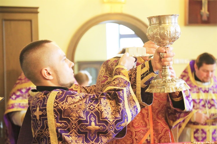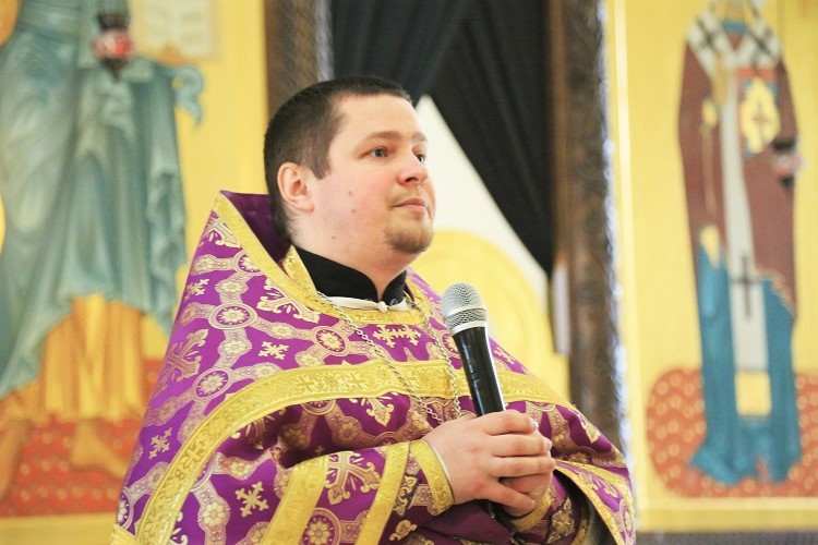 Проповедь по запричастном стихе произнес клирик Никольского кафедрального собора иерей Алексей Поляков.