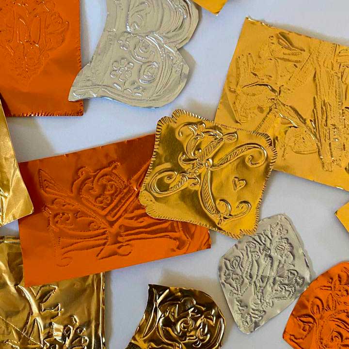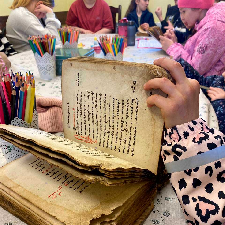 Особенный интерес вызвала практическая часть: ученики Воскресной школы сами печатали красивые буквицы в технике чеканки по фольге, а также с вниманием рассматривали и листали старинные издания богослужебных книг.