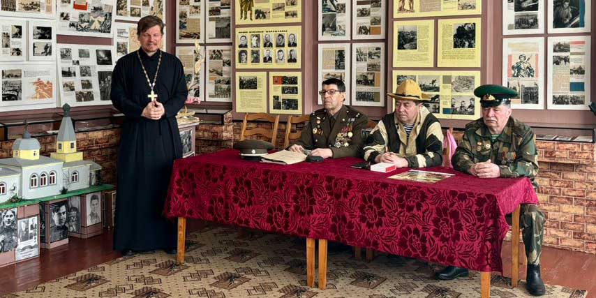 Перед началом беседы настоятель Космо-Дамиановского храма иерей Максим Киреев кратко рассказал о гостях. Он напомнил, что многих ветеранов уже нет с нами, так как они исполнили заповедь Господню: «Нет большей любви, чем если кто положит душу свою за друзей своих».