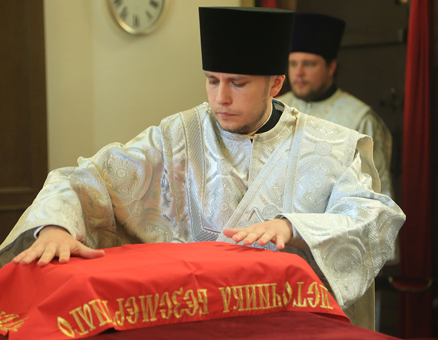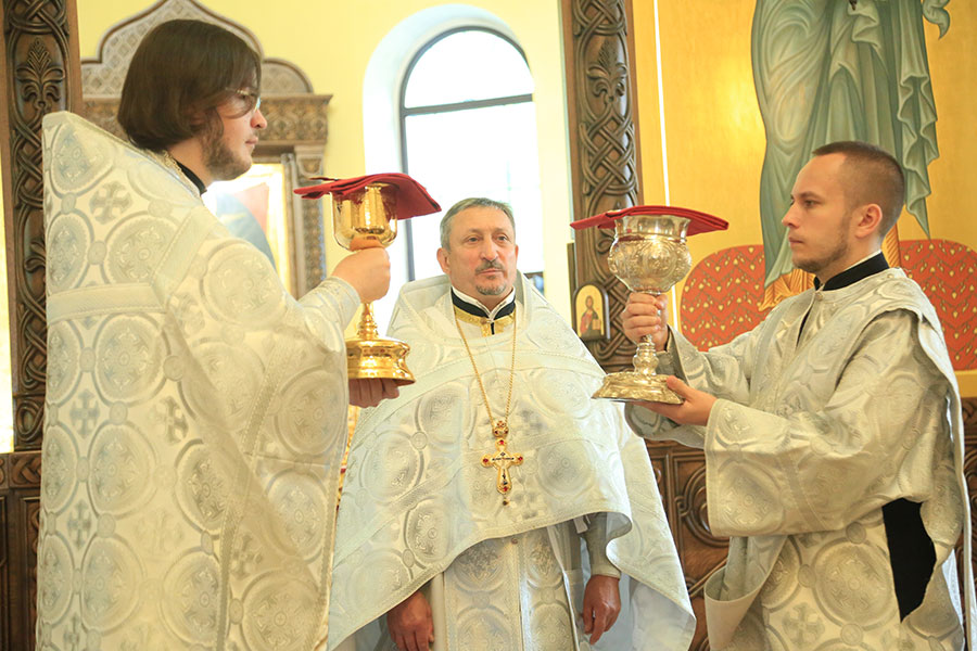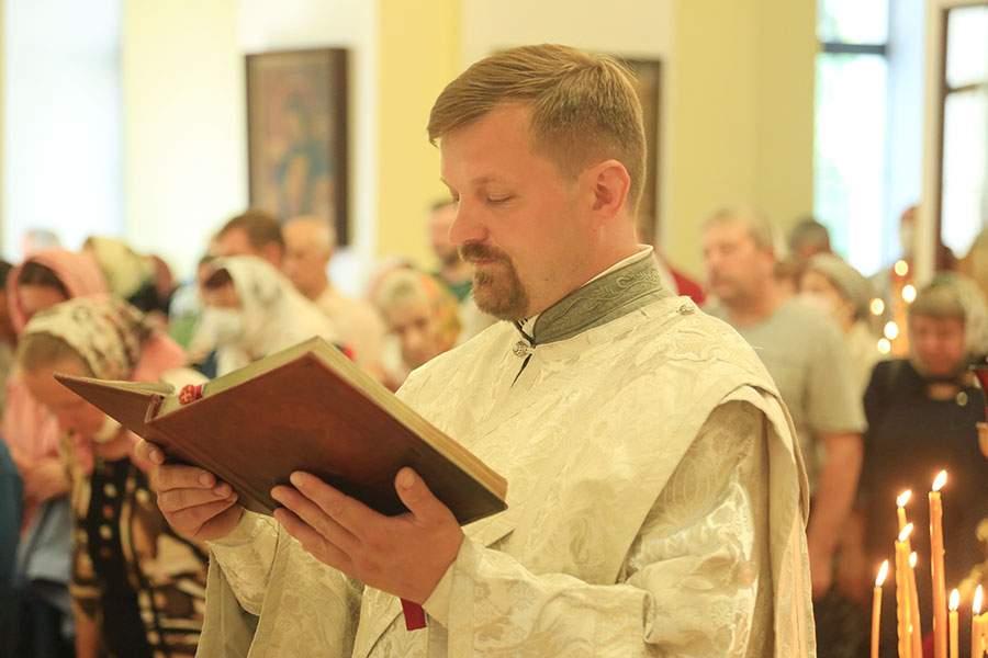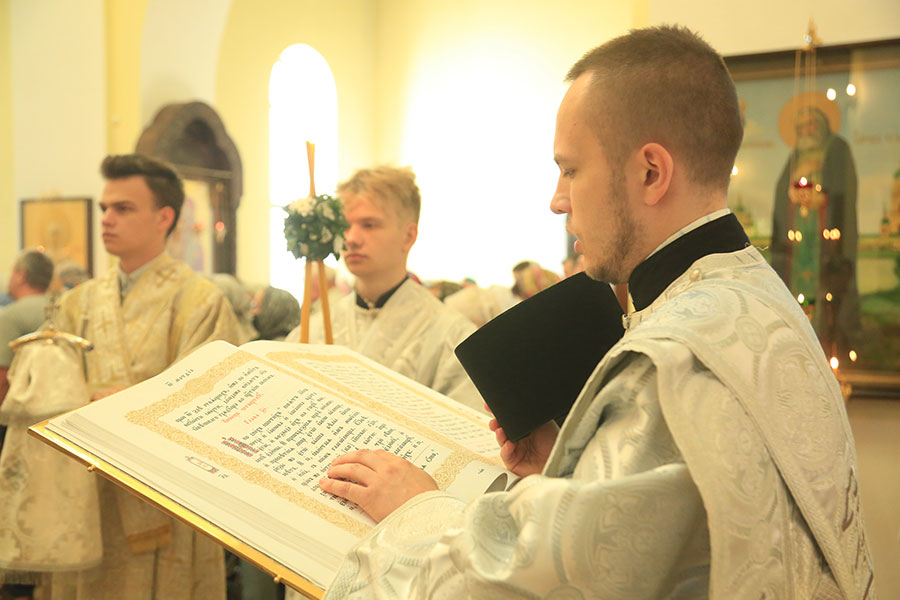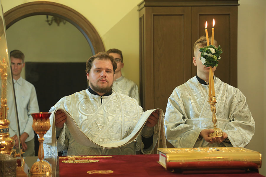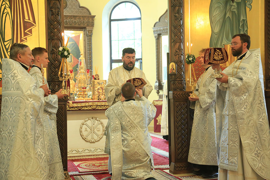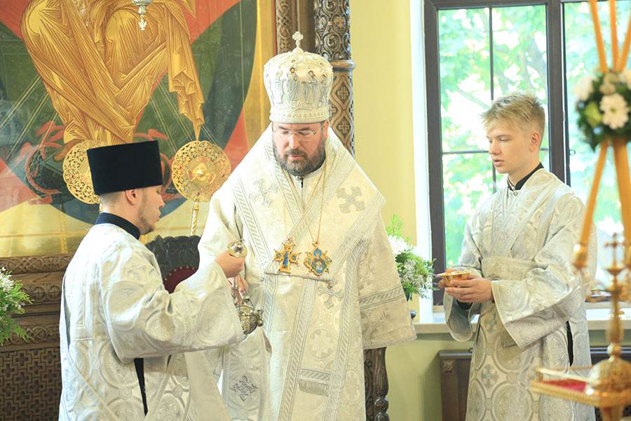 Его Преосвященству сослужили: настоятель Никольского кафедрального собора иерей Сергий Гусар, протоиерей Михаил Прокофьев, иеромонах Эмилиан (Гуменюк), диакон Павел Журавский, диакон Аркадий Андреев, диакон Илия Федоров и клирик Свято-Духова кафедрального собора г. Минска диакон Вячеслав Дубяга.