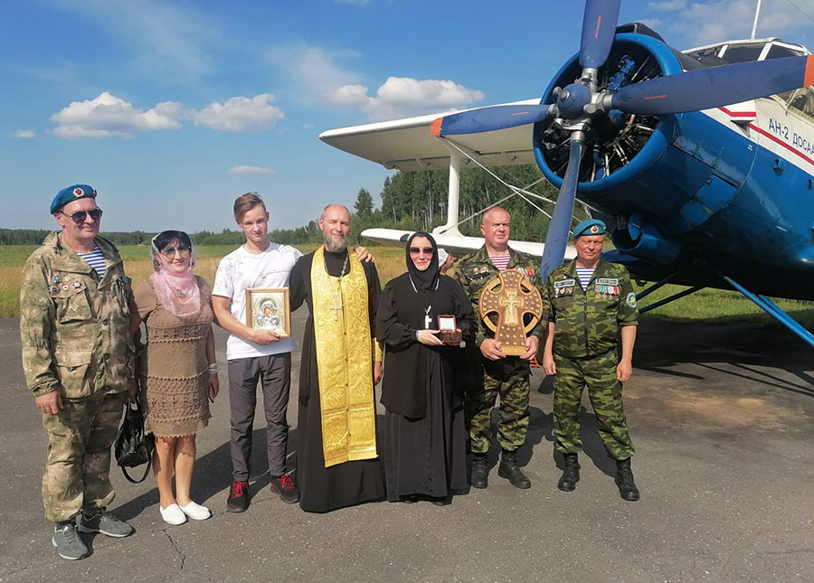 В самолете над городом находились православные святыни: Крест с частицами мощей многих угодников Божиих, образ Пресвятой Богородицы «Казанская» и другие иконы.