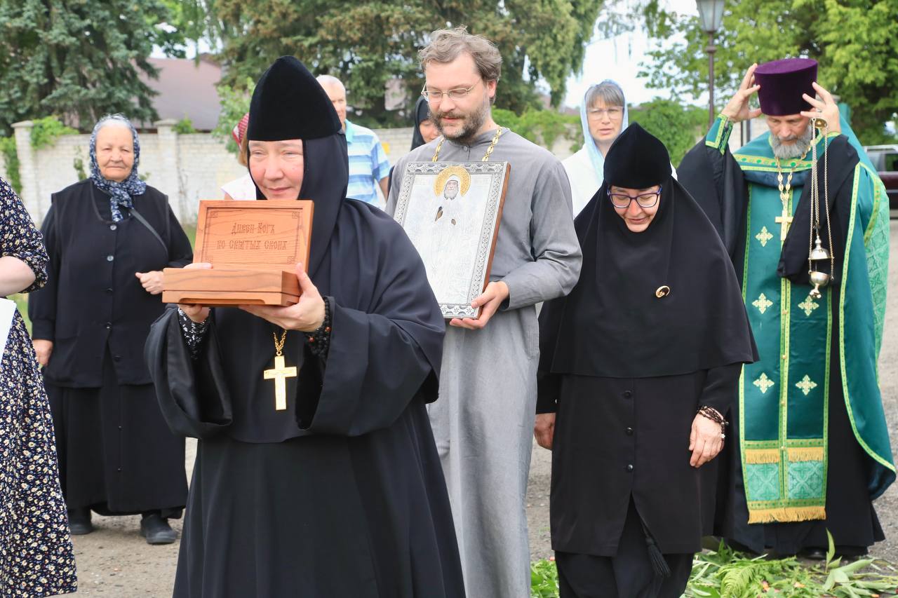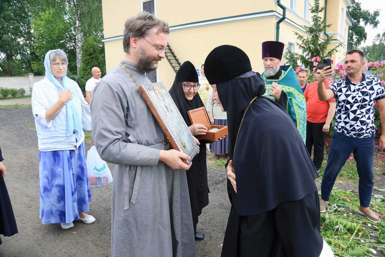 22 июня в бобруйском монастыре в честь святых Жен-Мироносиц встретили икону с частицей мантии и ковчег с частицей мощей преподобного Гавриила Самтаврийского (Ургебадзе). Привезла святыни на наши земли инокиня Мария (Глущенко), насельница подворья Свято-Успенского женского монастыря в Кемерово.