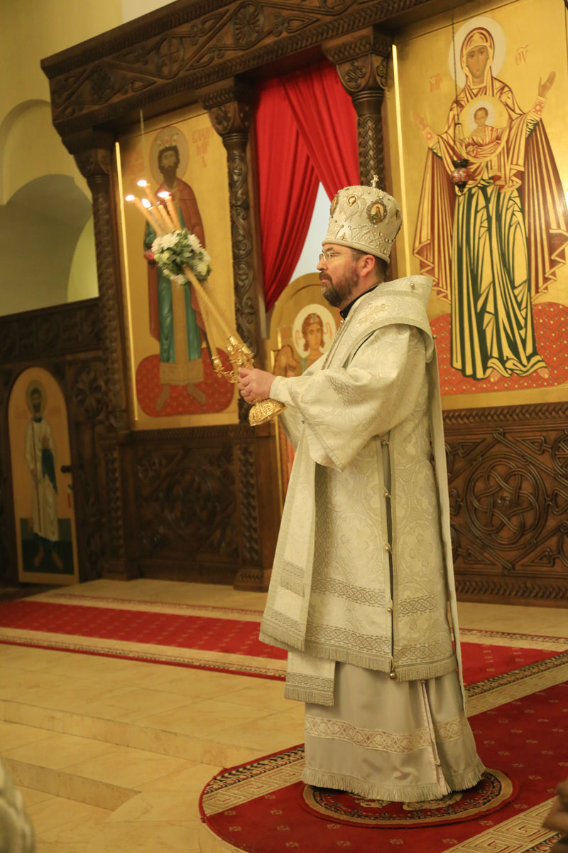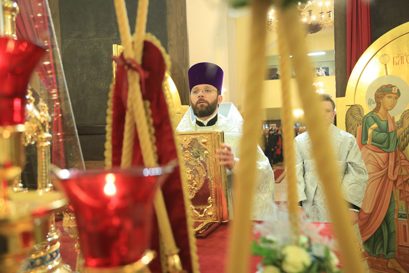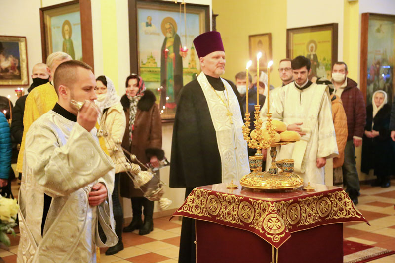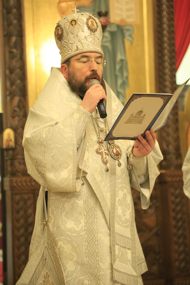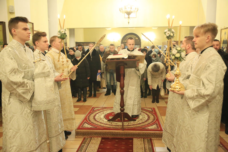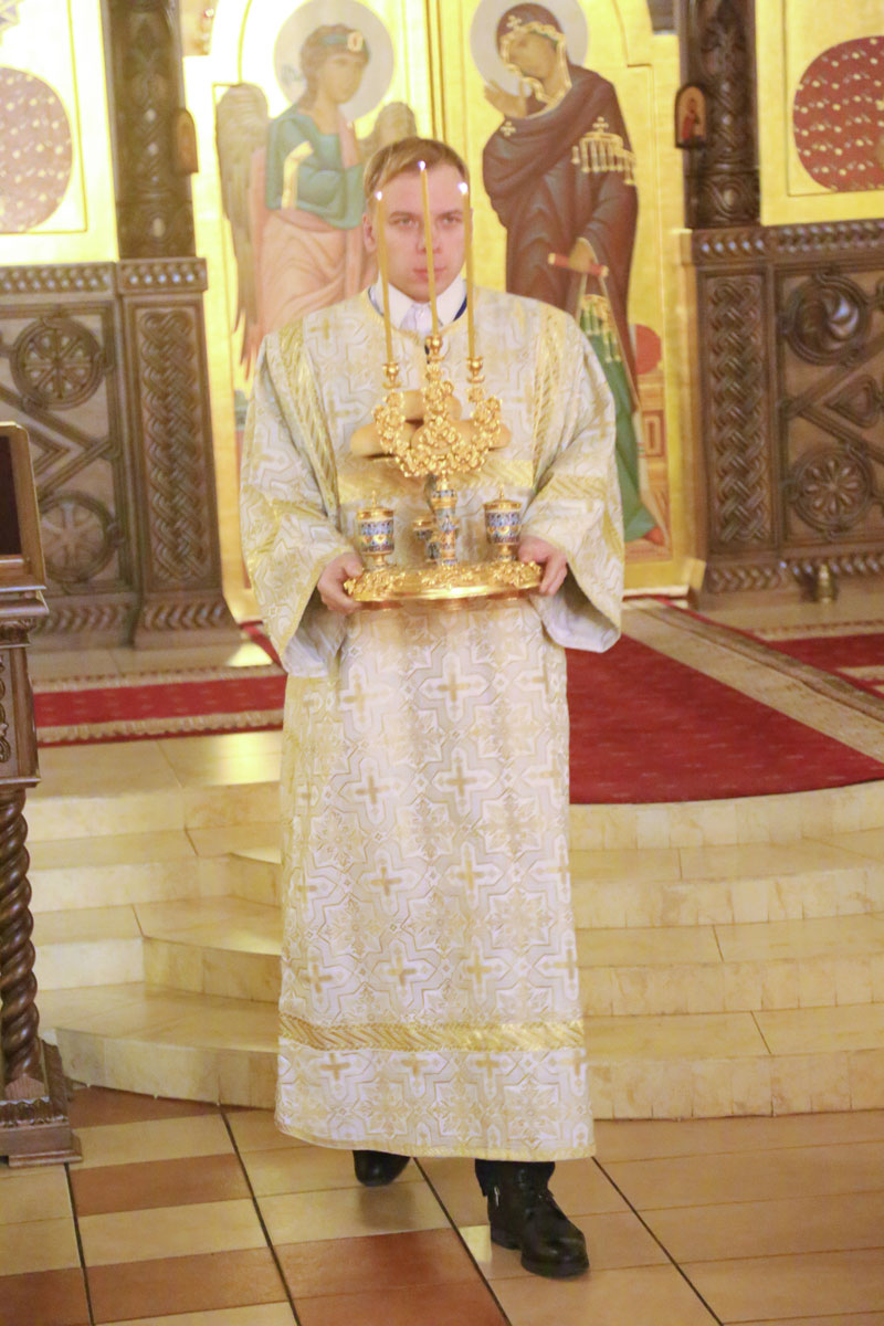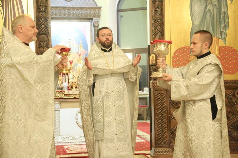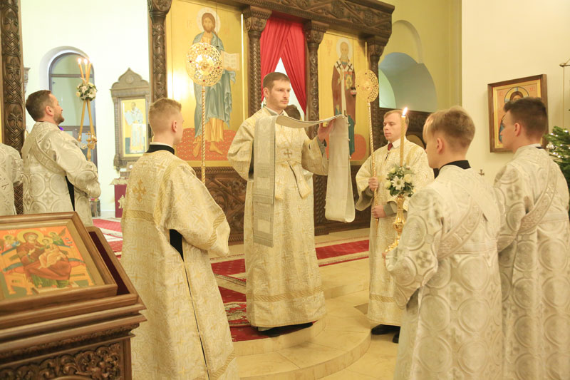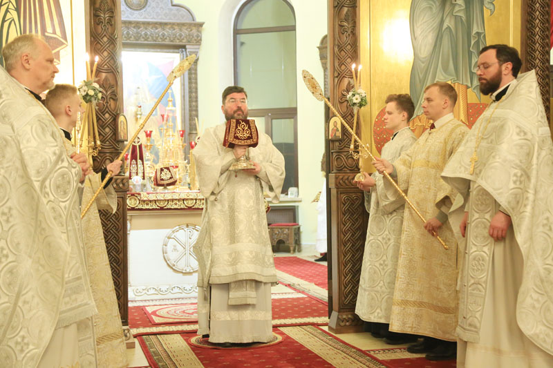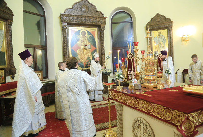 Его Преосвященству сослужили: настоятель Никольского кафедрального собора иерей Сергий Гусар, иерей Алексий Болотов; диаконы: Павел Журавский, Аркадий Андреев.