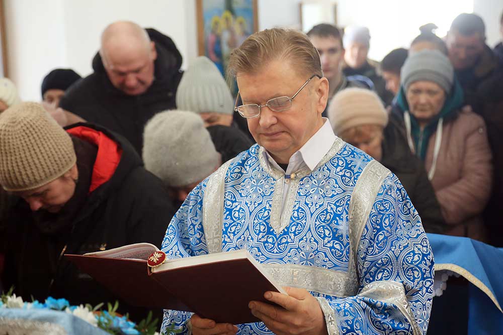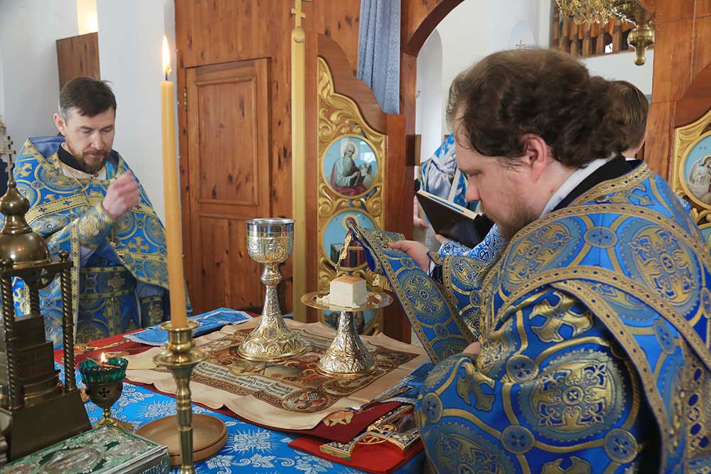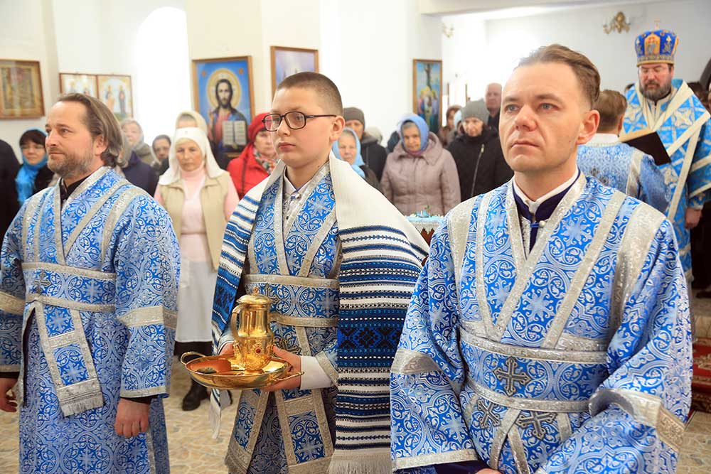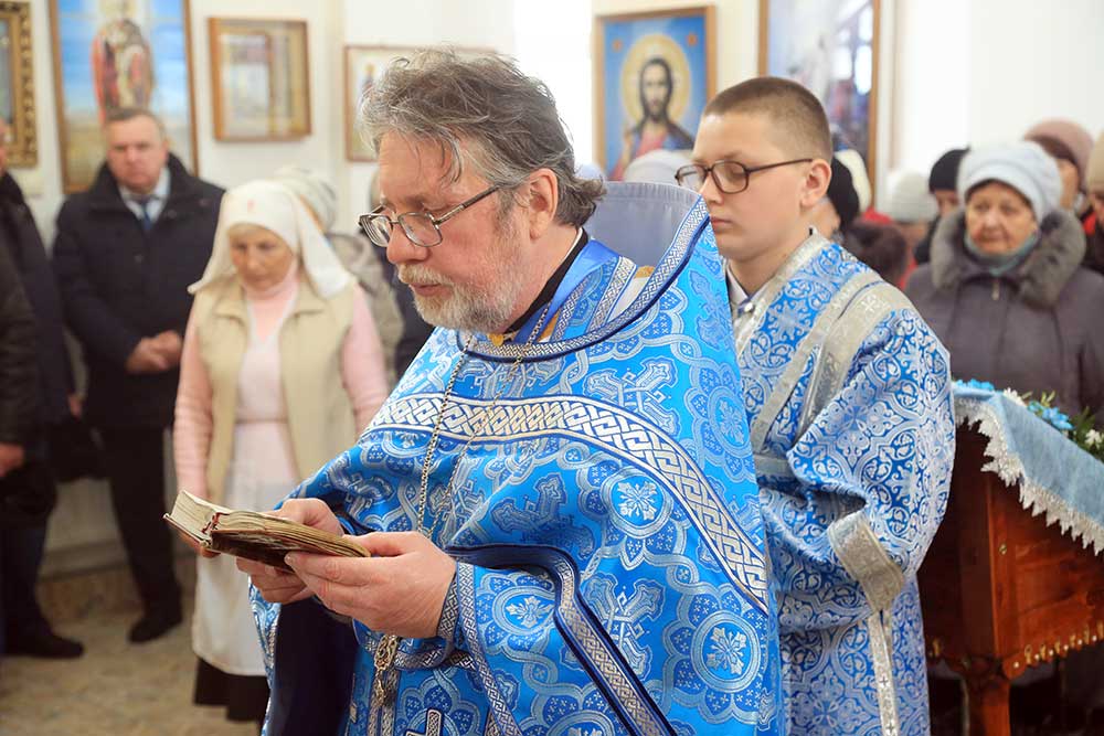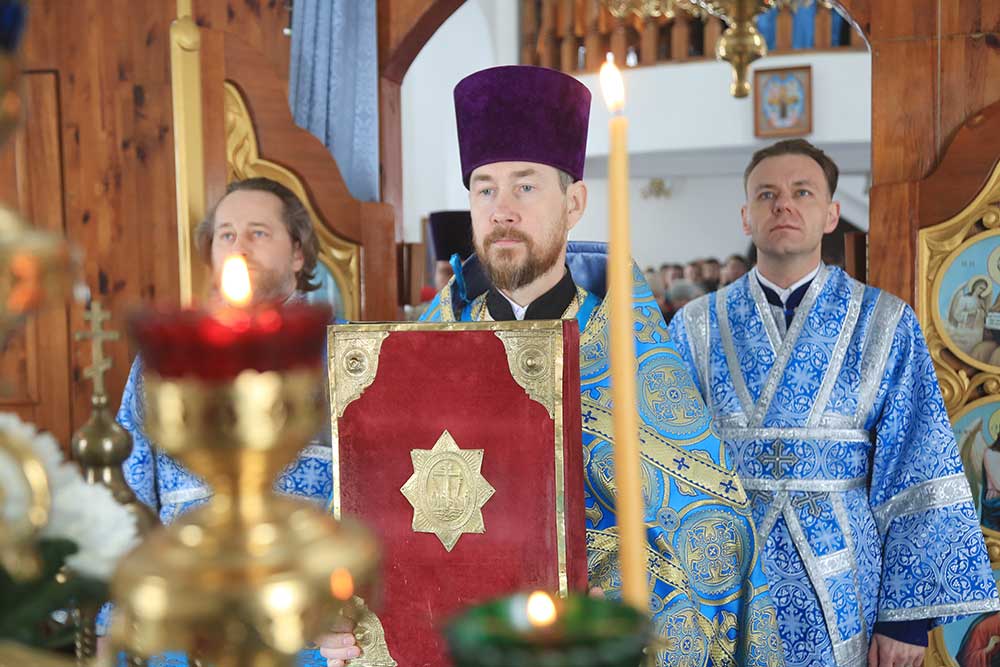 Его Преосвященству сослужили секретарь Бобруйского епархиального управления протоиерей Сергий Коровинский, благочинный Кличевского районного округа, настоятель храма протоиерей Сергий Андреев.